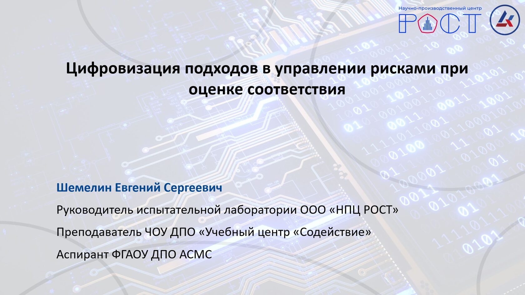 Шемелин Е.С. выступил спикером с докладом на тему «Цифровизация подходов в управлении рисками при оценке соответствия». В рамках доклада была рассмотрена концепция риск-ориентированного подхода при оценке соответствия продукции, озвучены существующие сложности и предложены решения по внедрению данного подхода в деятельность испытательных лабораторий с использованием инструментов цифровизации.